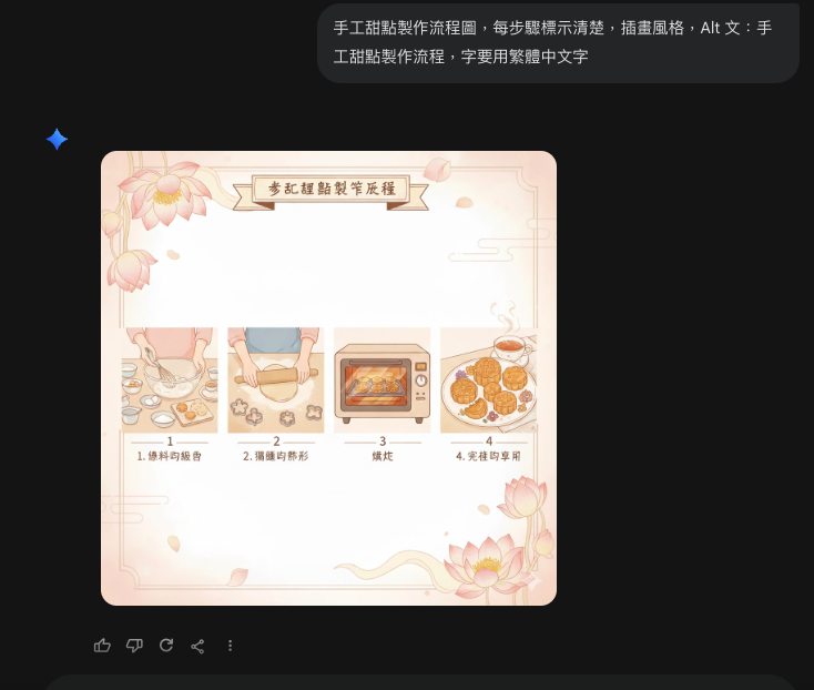 - 提示詞示例:「手工甜點製作流程圖,每步驟標示清楚,插畫風格,Alt 文:手工甜點製作流程」