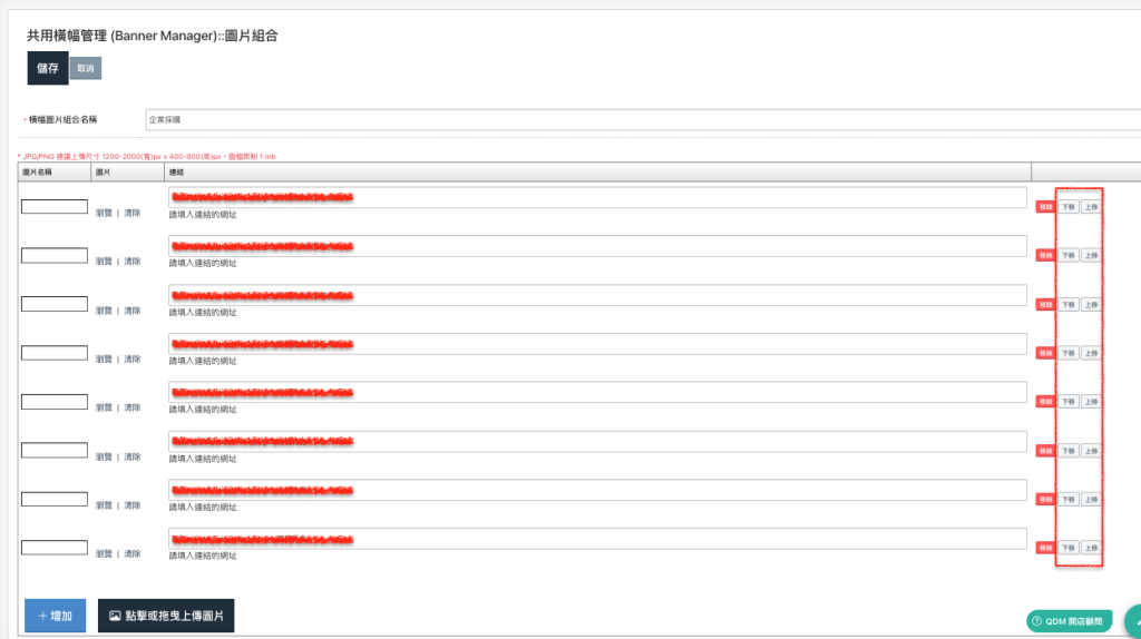 - 圖像上傳與排序:QDM提供調整顯示排序設定功能,店長們可依行銷優先級或轉化潛力,安排輪播圖的顯示順序,讓重點內容先行曝光。